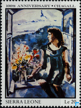 色彩の運用においては, 全体を支配する青とグレーの寒色系が, 感情的・心理的な深みの視覚化として機能している.シャガールの青は, ユダヤ神秘主義[カバラー]における神聖・超越の象徴とも, 彼のヴィテブスク時代からの記憶の色調とも連関し, 単なる感覚的効果を超えた象徴的重みを担っている.この寒色の世界に花束の暖色が穿たれることで, 喪失と生命, 過去と現在の弁証法的緊張が画面上に生起する.