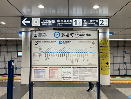 茅場町駅には, 東西線・日比谷線ともに全列車が停車する.東西線は中野方面および西船橋方面, 日比谷線は北千住方面および中目黒方面を結び, いずれも都心部と郊外を直通する基幹的通勤路線である.特に朝夕のラッシュ時間帯には利用者が非常に多く, 東西線は東京メトロでも屈指の混雑路線として知られ, 茅場町駅もその影響を強く受けている.