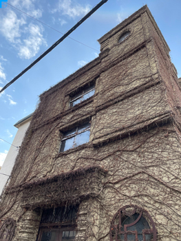外観はアールデコ様式を基調とし, 中央に入口, 両脇に丸窓のある左右対称のつくりを基本としながら, 右にある横長の線は正面から側面に回り込むなどスピード感を強調するデザインとなっている.一見左右対称だが, 実は玄関の左右にある丸窓の枠の意匠が異なっていたり, 2階と3階の窓の下の横の線も右と左で違うなど, 変化をつけている点がアールデコの特徴を表している.蔦の絡まる外観も印象的で, 印象的な窓飾りや階段の意匠, 西洋と東洋が融合したエキゾチックな内部も見所である.