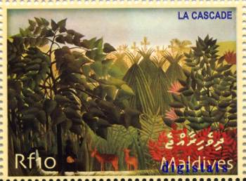 日曜画家の元祖にして19世紀−20世紀フランスの素朴派の画家であるアンリ・ルソー(1844-1910)の作品。その素朴な洗練されているとは言いがたいが高い芸術性ゆえにキュビスムを先導したアポリネール、ピカソに評価されたのだろう。批評家のアポリネールは印象派を批判したが、原色でくっきりと色分けされた絵には淡い印象派の曖昧さはまるでない。