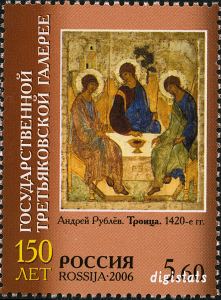 トレチャコフ美術館所蔵の アンドレイ・ルブリョフ の1420年の作品。父なる神と子なるキリストと聖霊が別々のようでありながら根は同じだとする三位一体はキリスト教の重要な考え方。東方正教会がローマカトリックから明確に分離したのは1204年の第四回十字軍の時。1453年にはコンスタンティノポリス陥落しロシア正教が東方正教の最後の後継者となる。それぞれを独立した人格で描く三位一体の考えはロシアに引き継がれた。
